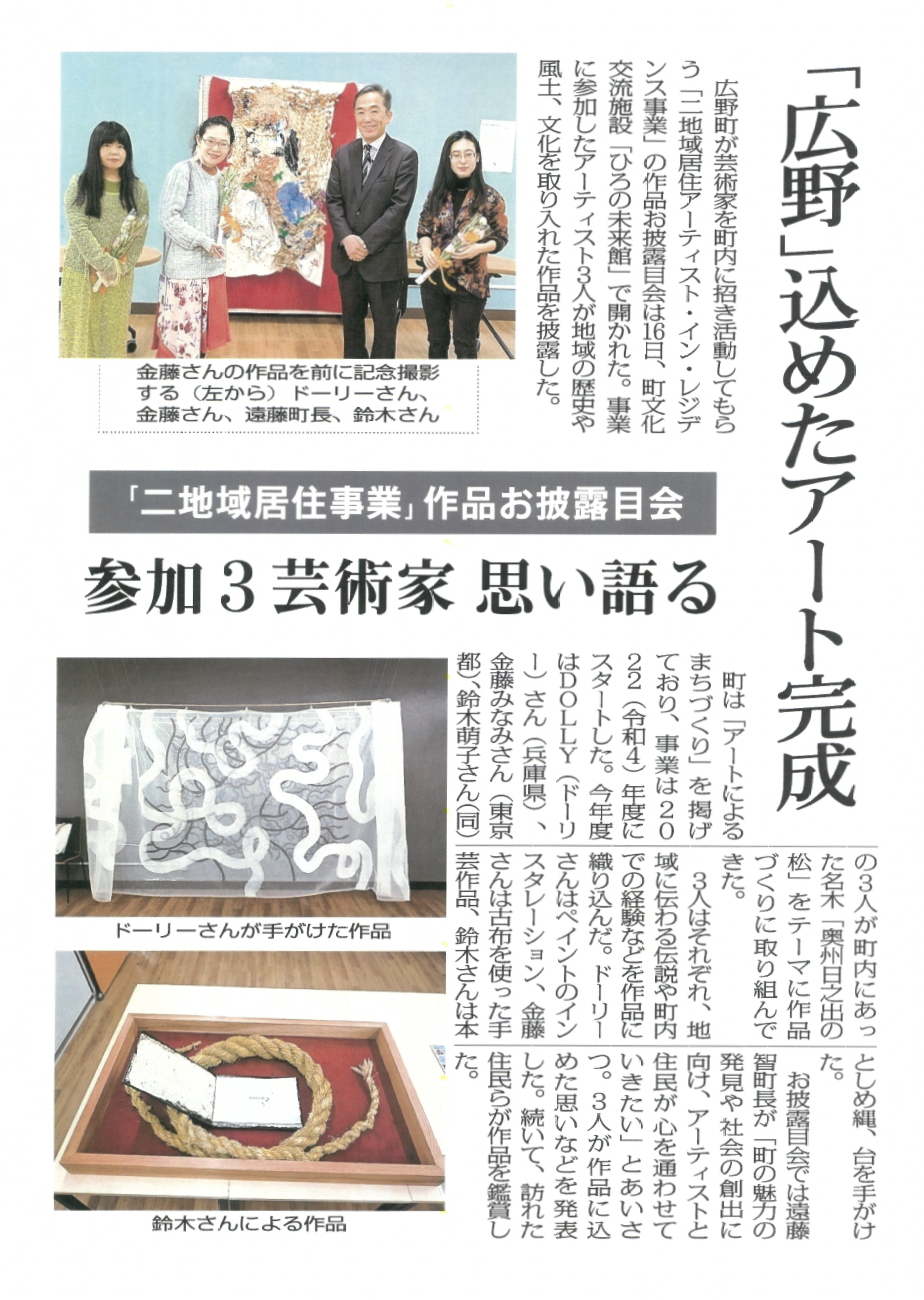 [JP] 福島民報 「広野」込めたアート完成 2地域居住アーティスト事業の作品お披露目 福島県広野町 2025.03.17