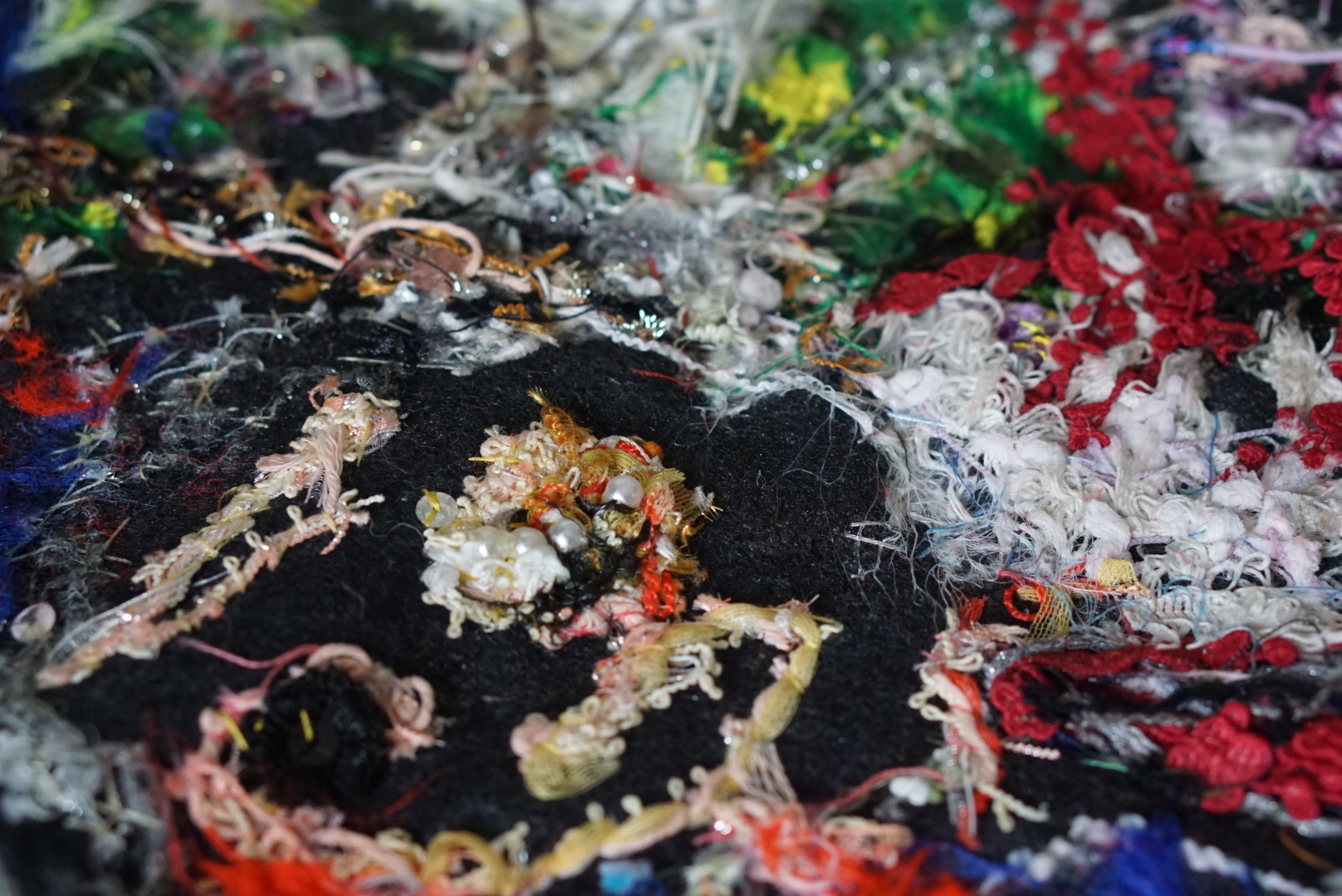 A detail of my artwork.Upcycling of discarded clothes through dense embroidery and couching stitch.