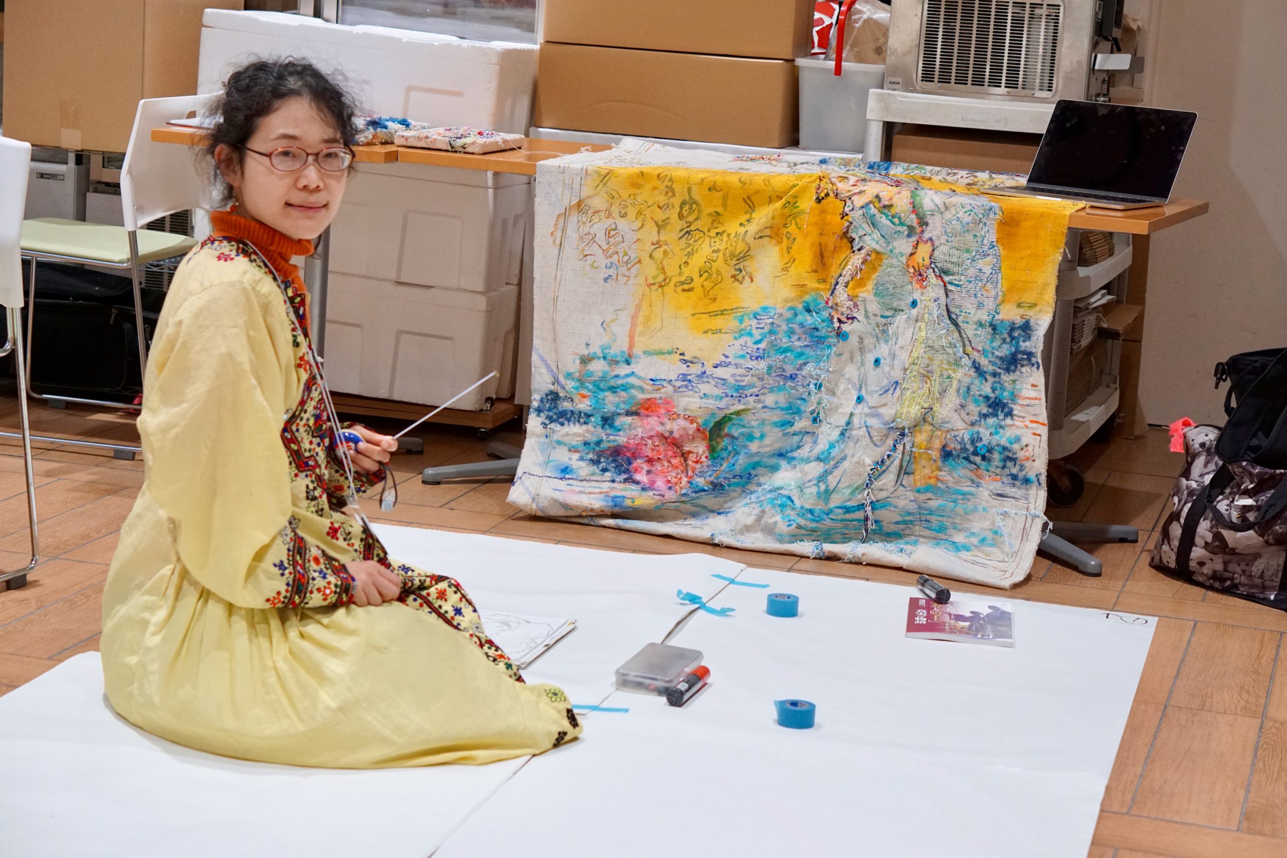 初めて広野町を訪れ、「日之出の松伝説」の語りを聞きました。竹女は広野町出身ですが、観光協会の鈴木会長の「竹は召使なんかじゃない、聡明で高貴な人だ!」という力強い言葉に深く感銘を受け、今刺繍をしています。生き様を讃えるような作品をつくりたいです。