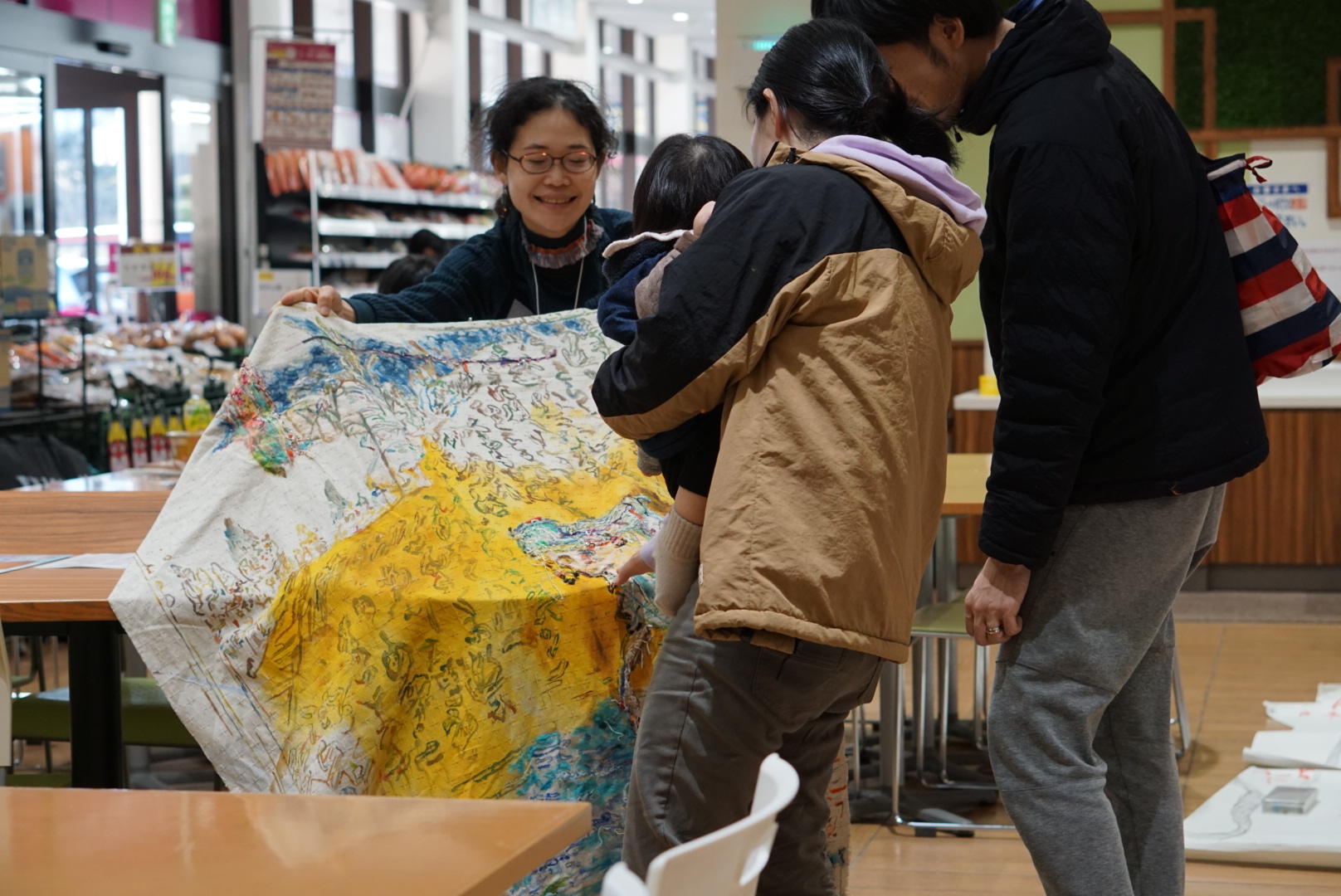 ひろのてらすで合計7日ほど制作とWSをさせていただき、みなさんと布に穴を開けておしゃべりをしながら、パートナーや子どもたちと広野町を歩きながら、「ああ、竹さんや主人公の母の生き様を讃えるような作品を作りたい」と考えました。